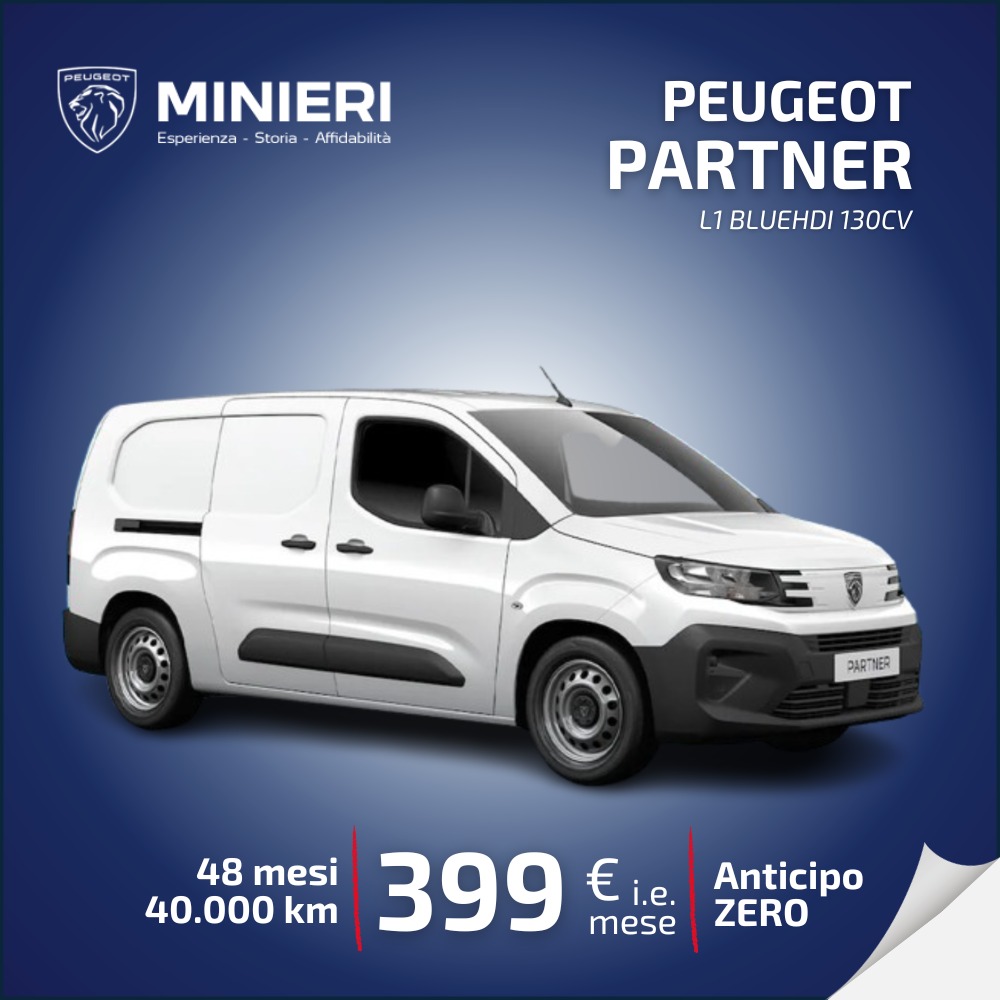 Questo Peugeot Partner proposto da Minieri Rent per il mese di aprile 2026 è disponibile con allestimento L1 con motore diesel BlueHDi da 130 cavalli.